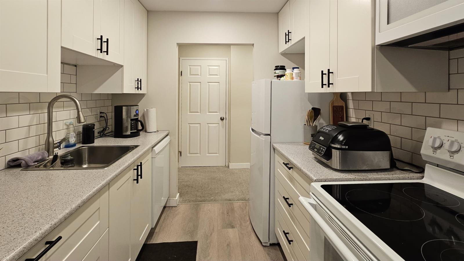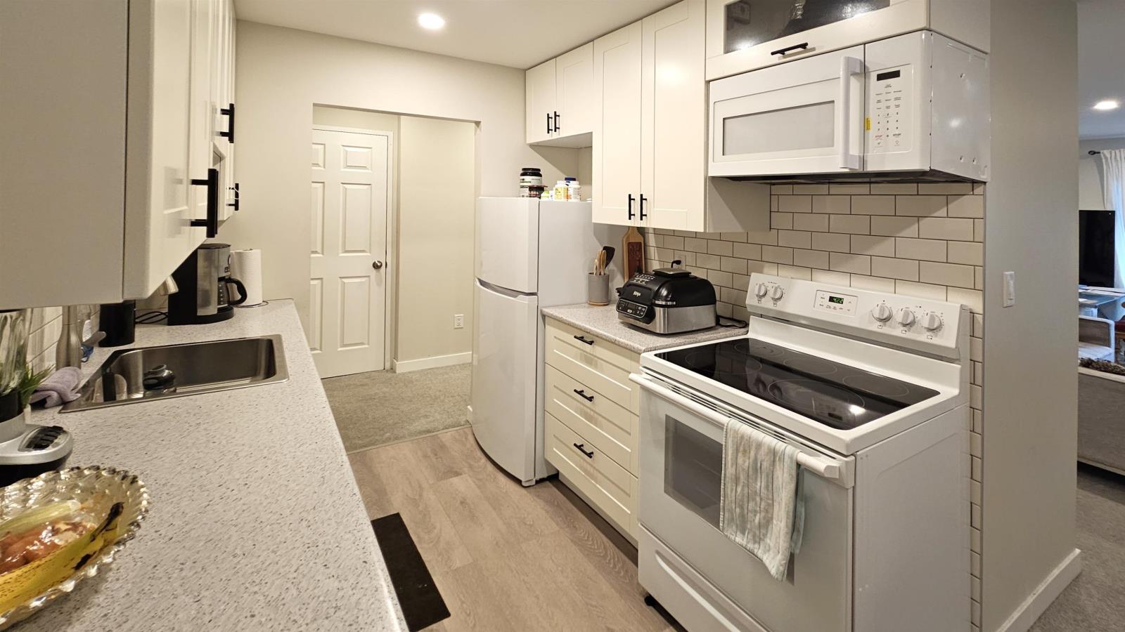 Welcome to Mcintosh Manor! This spacious South-facing 1 bedroom and bathroom condo has been tastefully renovated with new kitchen cabinets and appliances, updated bathroom, recessed lighting, paint, and carpeting. Lots of natural light filters into the unit. Enjoy the sunshine on your good-sized balcony and wash your clothing in your insuite laundry. New vinyl sliding door and window for the unit. Easy access to Hwy 1, and a short drive to Cottonwood Centre, 2 min drive to the new YMCA, 3 mins to District 1881, schools and amenities. Rentals allowed. Don't miss out! (id:59116)