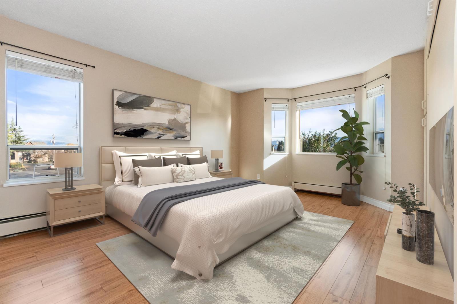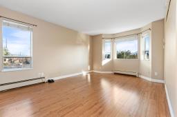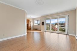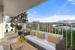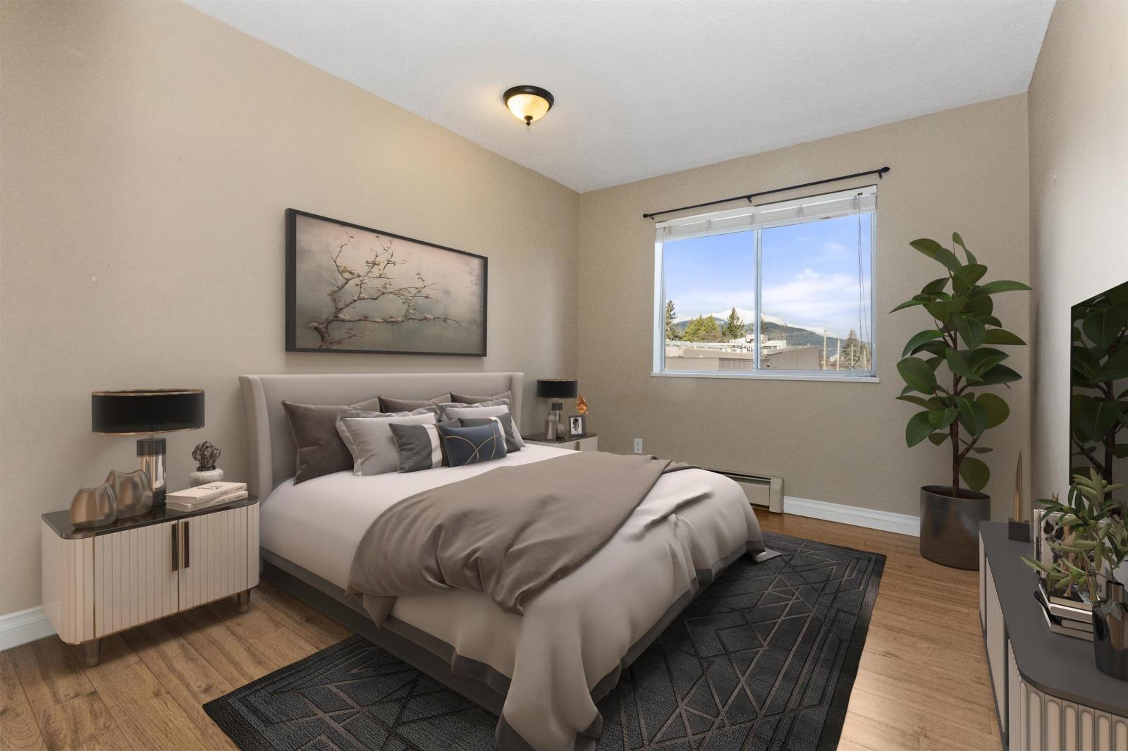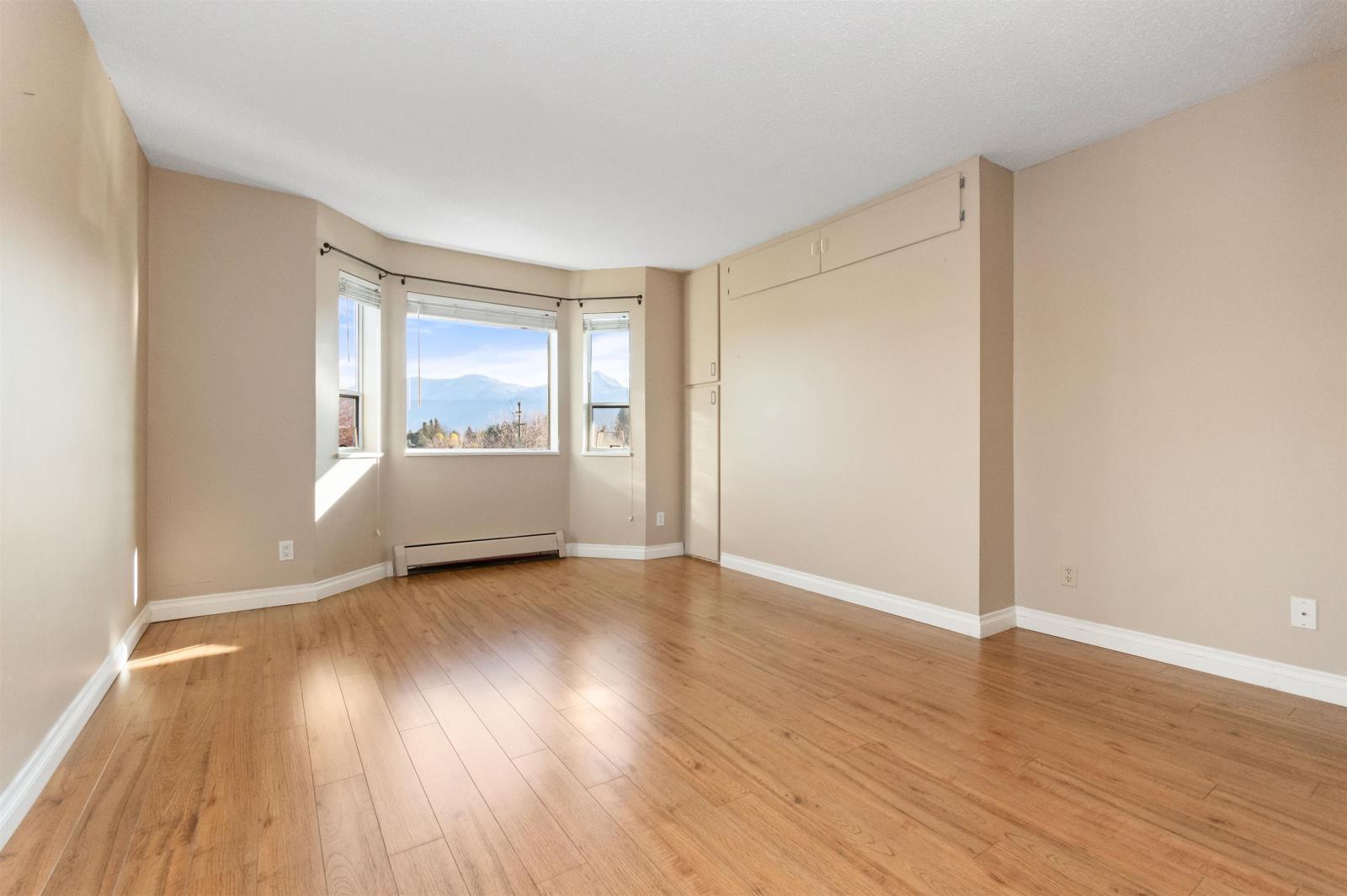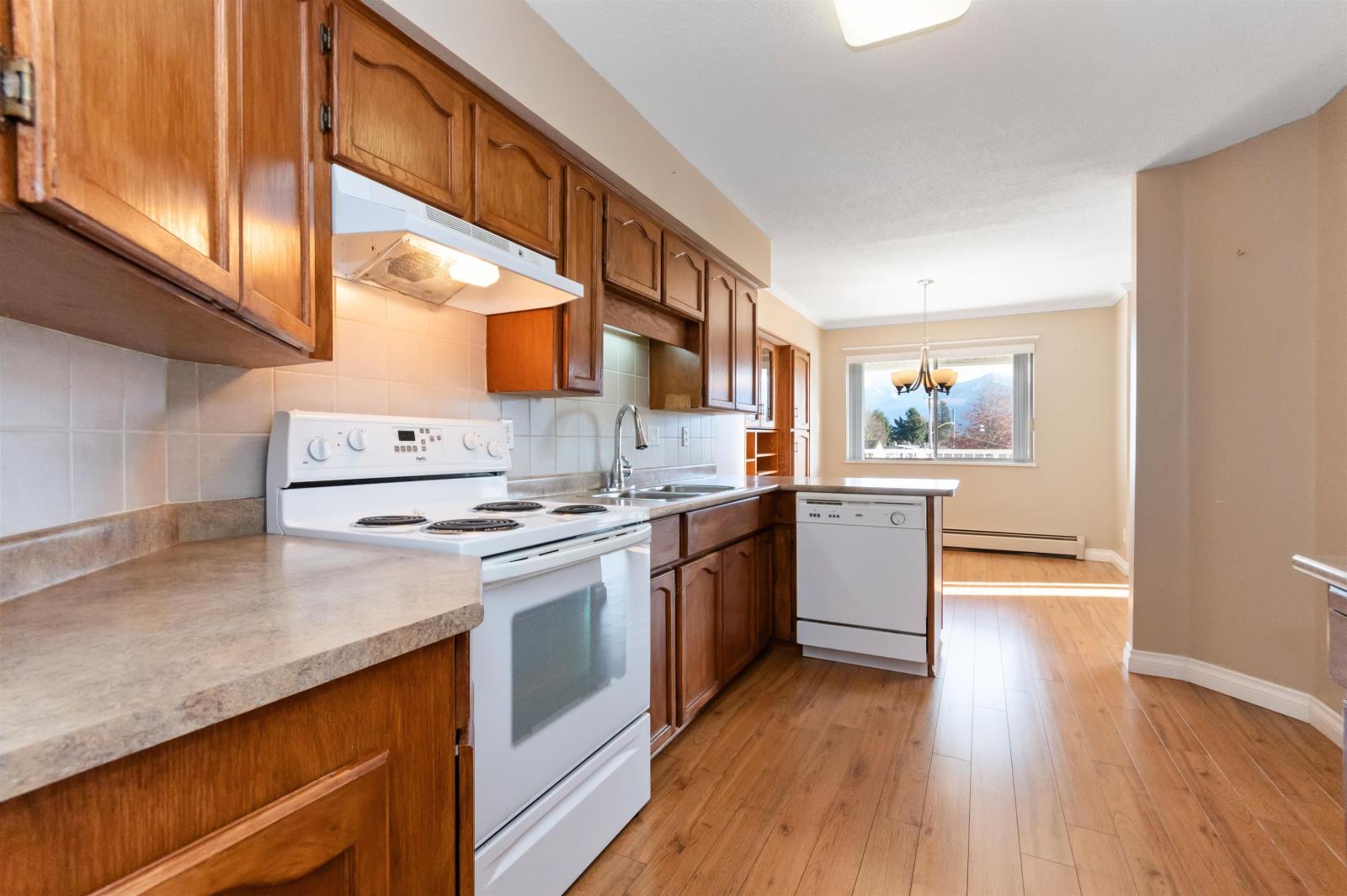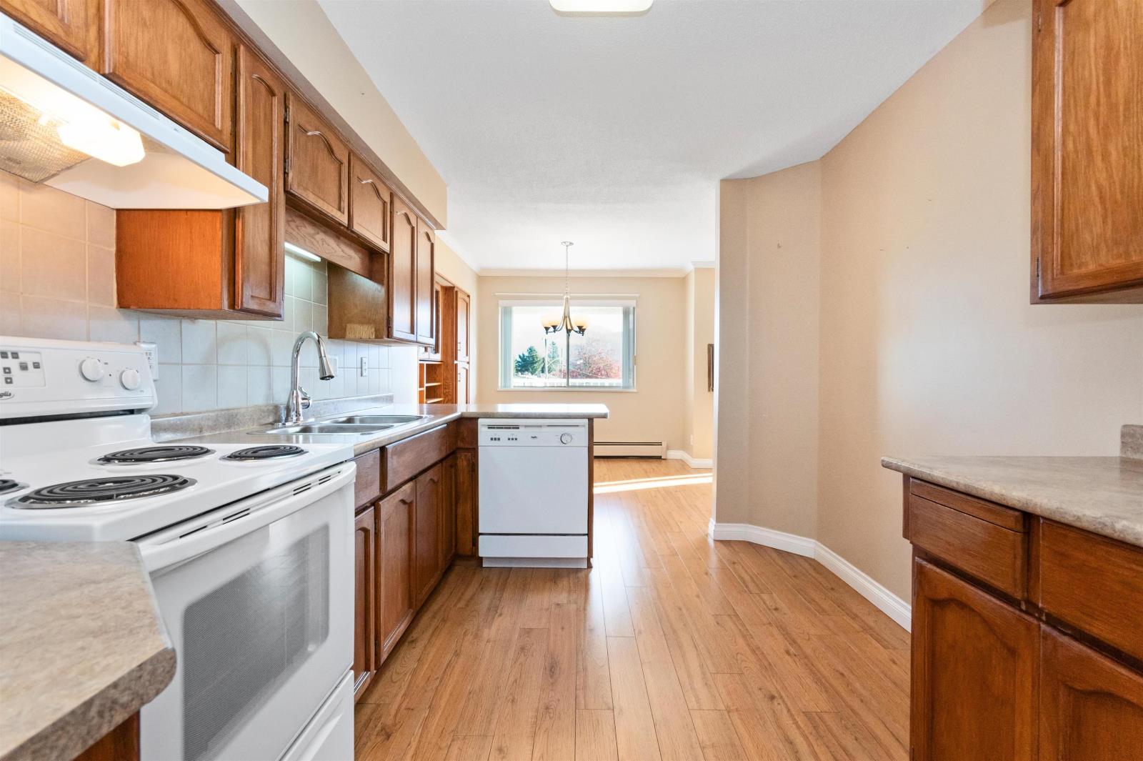 Merry and Bright corner unit with 2 bedrms, 2 full bathrms, 1,124 sq ft of comfortable living space. Living room with oversized sliding door to a large covered sundeck facing East with gorgeous mountain views. Classic kitchen with plenty of cabinets and newer countertops open to eating area. A separate laundry room is great for keeping things neat and tidy. Good sized primary bedrm with walk in closet and full ensuite with shower. Updated quality laminate floors throughout. Elmwood Terrace is a friendly age 55+ building with club house, workshop and exercise room. Strata fee includes water, sewer and heating in your home. Comes with storage locker and 1 underground parking, additional parking outdoors is available. Quick possession possible. (id:59116)