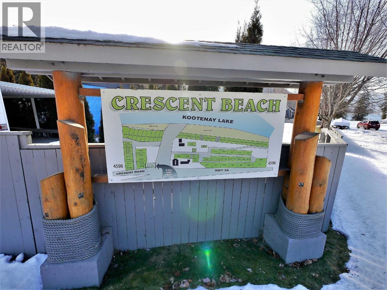 Visit REALTOR? website for additional information. STEAL OF A DEAL!!! New Marina being built by 2026 at Crescent Beach Resort - north shore of Kootenay Lake! One of the LARGEST lots at the resort! *NOW ABLE TO PUT IN TINY HOME OR A MODULAR HOME!!!! *Private parking stall *NEW Boat stall at soon to be NEW Marina *Steps to Lake *All hookups meet Z240 std & CSA certified *Walking distance to Kootenay Provincial Park, Kootenay Glacier Ferry golf course hikes. *Established deck & fire pit *All power, water, sewer, cable and Wi-Fi available! *Close to washrooms, laundry & common areas *Fenced *Easy beach access *Setup your unit, enjoy till end of Oct and kick off again in April! Bring your family, boat & enjoy the crystal waters of the Kootenay Lake. Located between Nelson and Balfour, this peaceful, seasonal resort offers gorgeous private beach w/ swimming area & boat slip, reserved parking & storage. (id:59116)