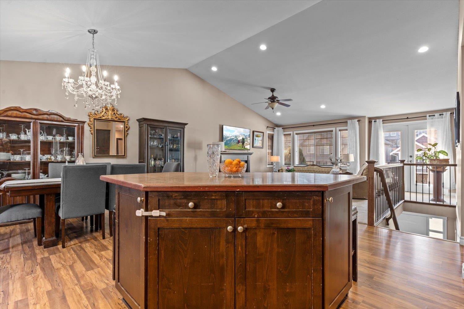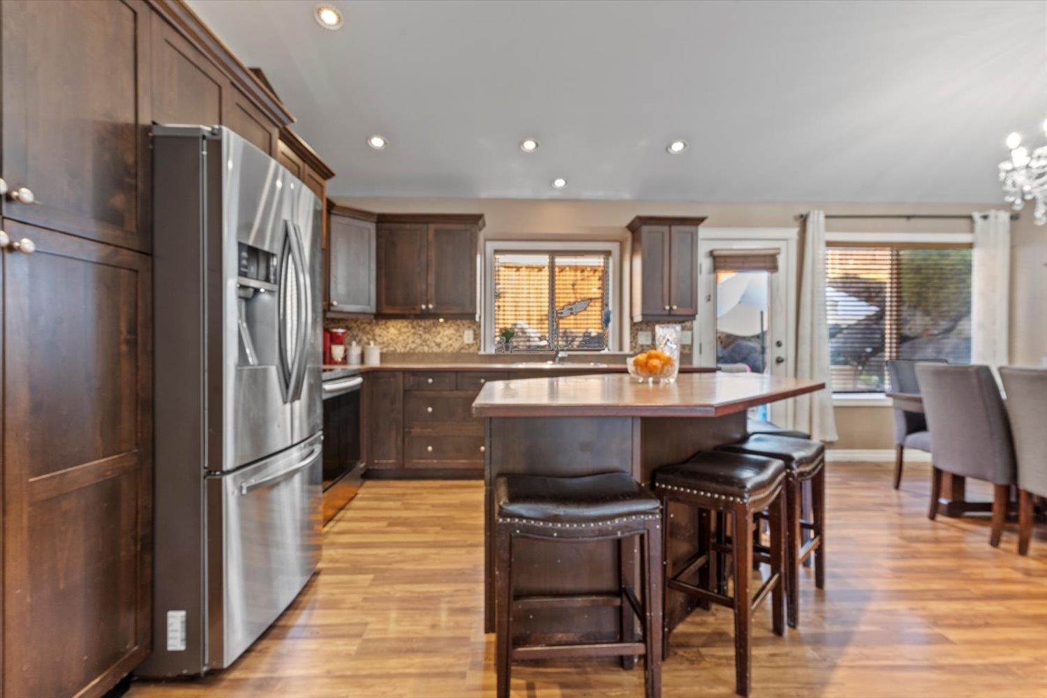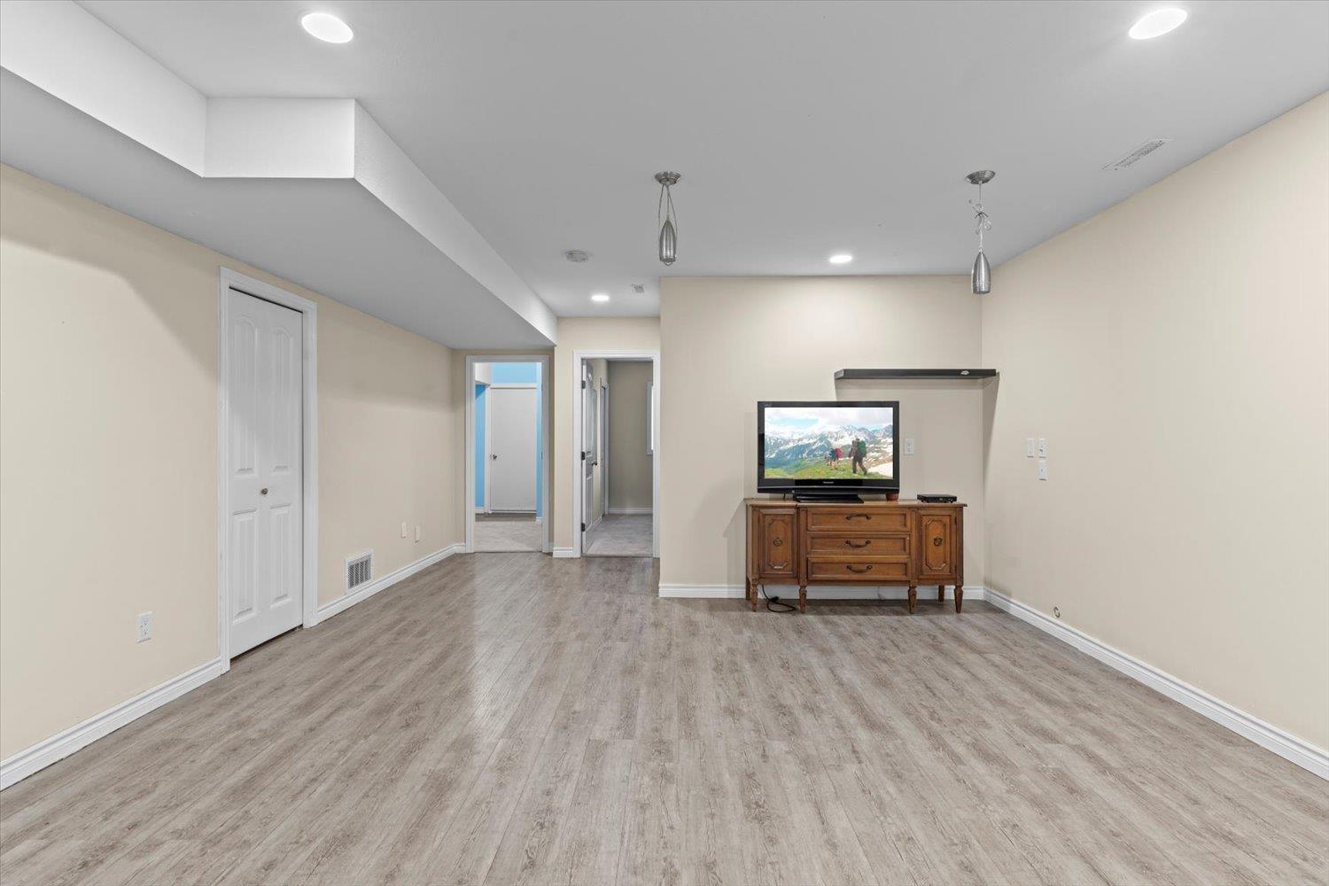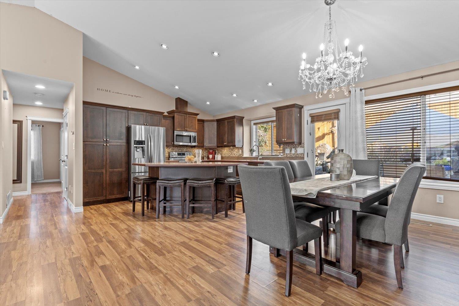 *Great 5-Bedroom, 3-Full Bathroom Family Home in Promontory!* The open-concept living and dining areas provide a spacious and flexible layout, ideal for hosting. Plenty of storage, incl. built-in pantry with pullouts, a 4-seater island, stainless steel appl. a tiled backsplash, and under-cabinet lighting. Enjoy access to two patios, where you can take in morning mountain views or afternoon valley scenery! The upper level includes 3 spacious beds, including a master suite with a walk-in closet and a full ensuite bathroom featuring both a tub and a shower. The entry level welcomes you with a tiled foyer and includes a bright den, a laundry room with a sink and storage, and a huge living room connected to the Kitch. Additionally, there are two more beds. The home also boasts a double garage. (id:59116)